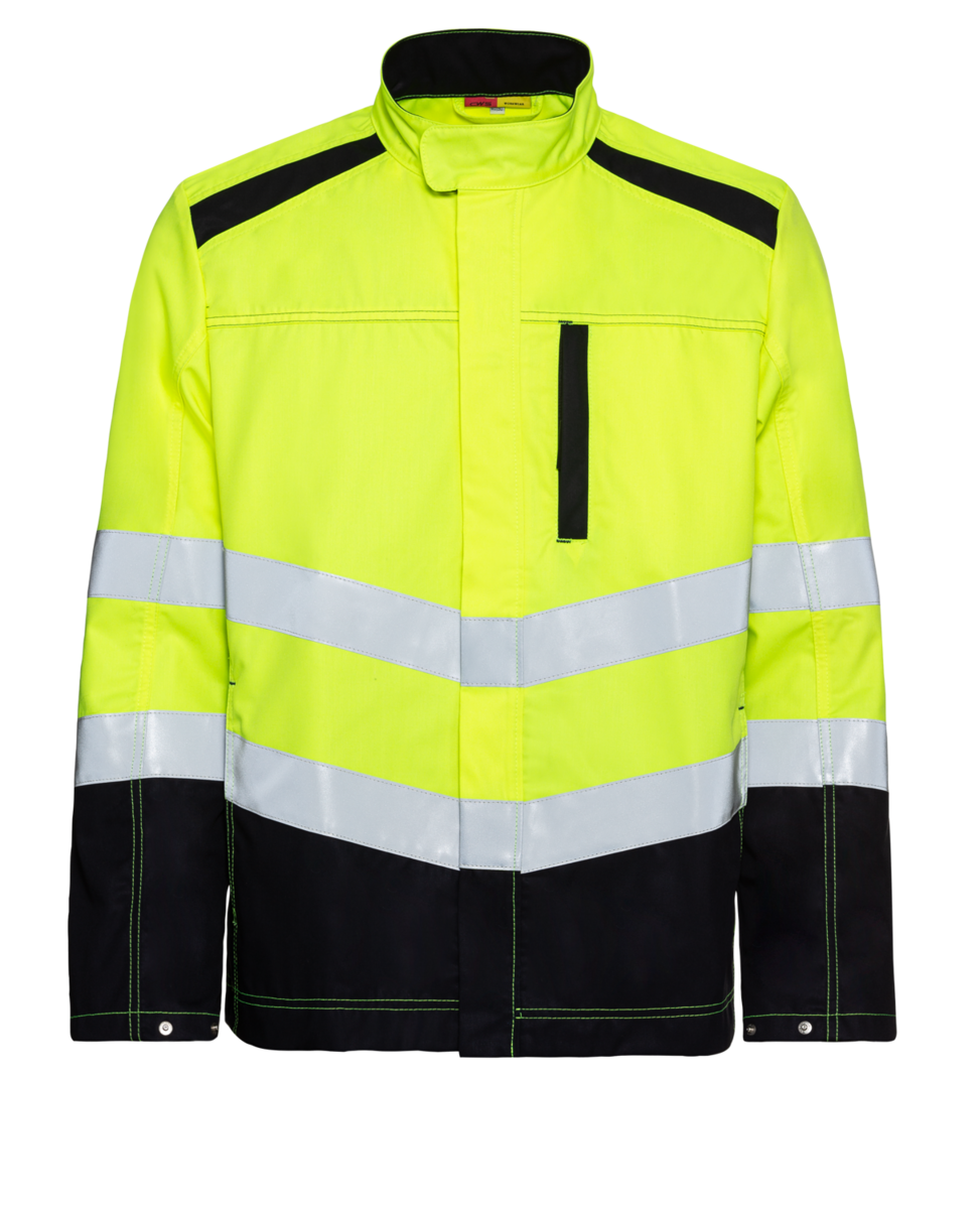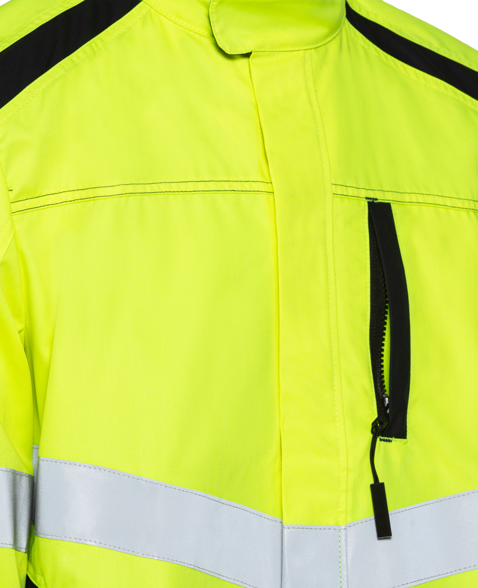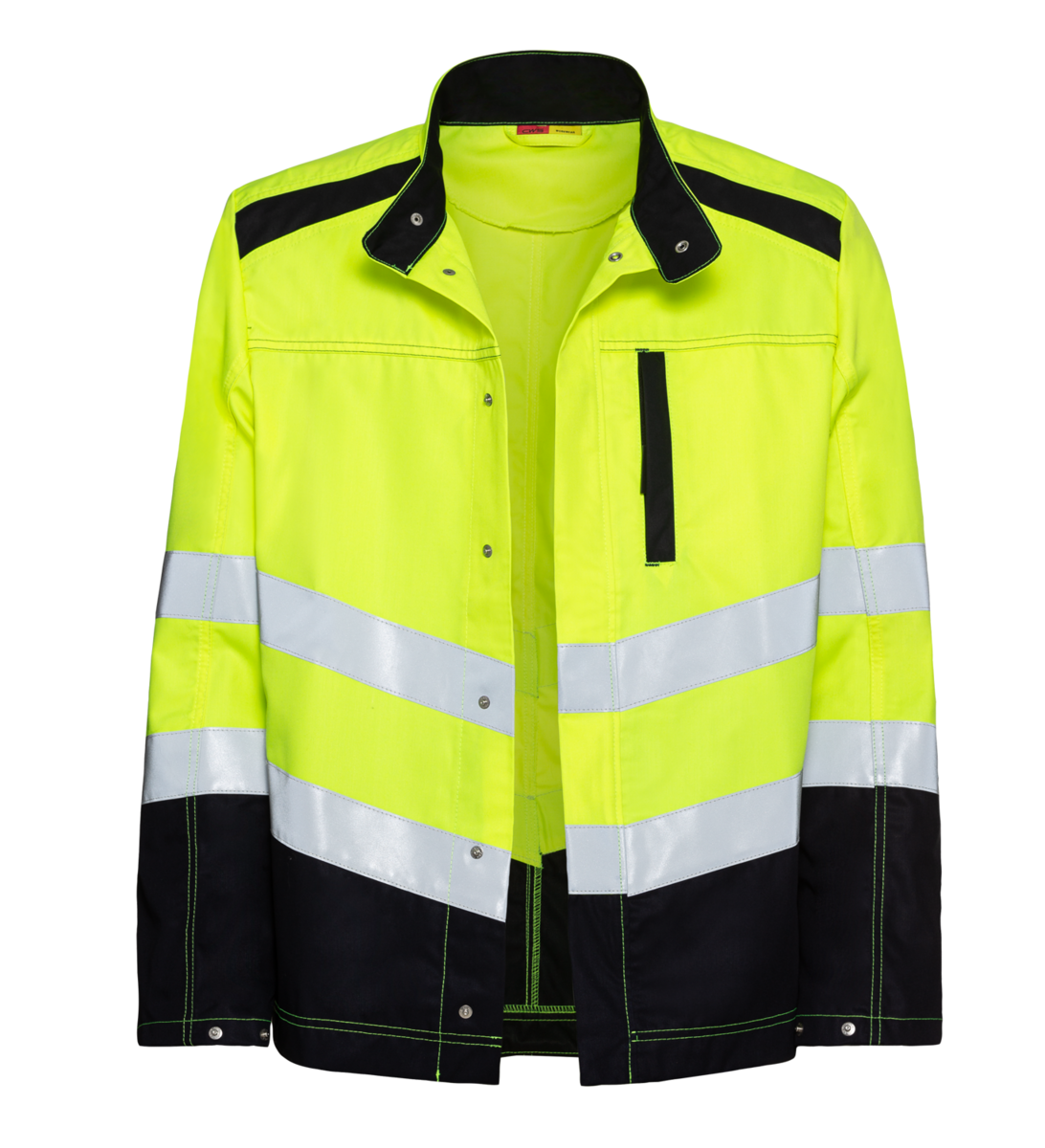 Die Warnschutzjacke besitzt einen Stehkragen mit Druckknopfverschluss, eine Frontleiste mit verdeckten Druckknöpfen und ein verlängertes Rückenteil, das vor Zugluft schützt. Umlaufende Reflexstreifen erhöhen die Erkennbarkeit. Die Ärmelsäume lassen sich mit Druckknöpfen in der Weite verstellen. Dunkel abgesetzte Partien an Ärmeln und am Bund sorgen dafür, dass Verschmutzungen weniger auffallen. Die Arbeitsjacke verfügt über zwei seitliche Eingrifftaschen mit verdecktem Druckknopf und eine Innentasche links. Die Brusttasche links besitzt einen Reißverschluss, der hochkant öffnet, was das Hineingreifen erleichtert.