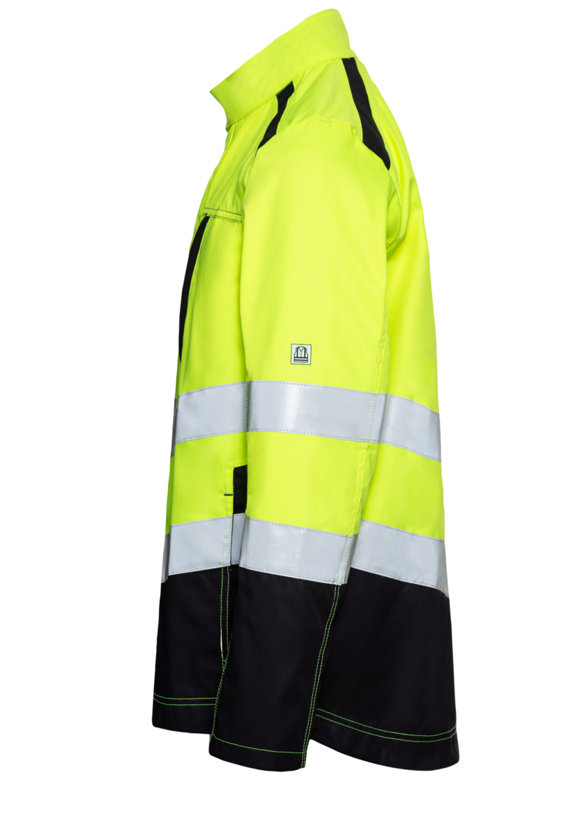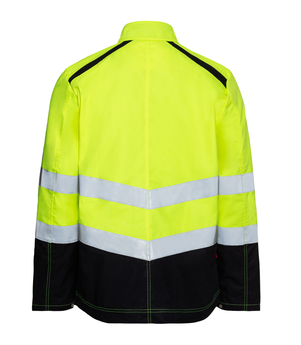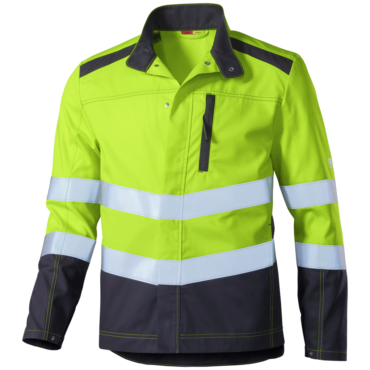 Die Warnschutzjacke besitzt einen Stehkragen mit Druckknopfverschluss, eine Frontleiste mit verdeckten Druckknöpfen und ein verlängertes Rückenteil, das vor Zugluft schützt. Umlaufende Reflexstreifen erhöhen die Erkennbarkeit. Die Ärmelsäume lassen sich mit Druckknöpfen in der Weite verstellen. Dunkel abgesetzte Partien an Ärmeln und am Bund sorgen dafür, dass Verschmutzungen weniger auffallen. Die Arbeitsjacke verfügt über zwei seitliche Eingrifftaschen mit verdecktem Druckknopf und eine Innentasche links. Die Brusttasche links besitzt einen Reißverschluss, der hochkant öffnet, was das Hineingreifen erleichtert.